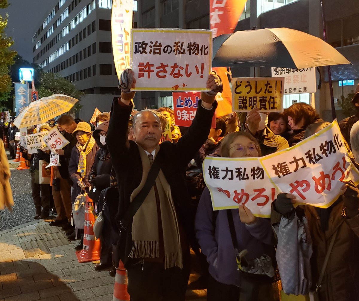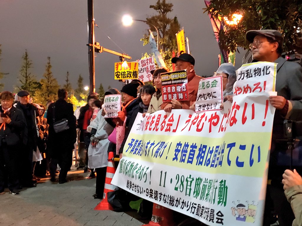 総がかり行動実行委員会が呼びかけた、 #1128官邸前緊急行動 です。野党の「桜を見る会」追及本部からも多数の国会議員が参加。