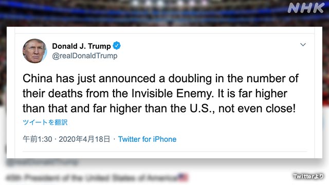 アメリカのトランプ大統領は17日、ツイッターに「中国は『見えない敵』による死者の数が倍になったと発表した。実際にはその数字よりもはるかに多く、アメリカよりはるかに多い」と投稿しました。