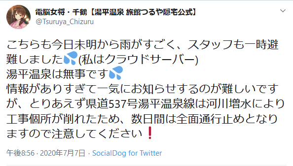 「電脳女将」のキャラクター「千鶴さん」が大分弁を交えて情報発信するユニークなスタイルが受け、旅館はサブカルチャー好きに人気の宿として知られる。- 2 名前:押しボタン式の匿名希望者 投稿日時:2020/07/12(日) 13:26:24.62 ID:1KATKO3p0