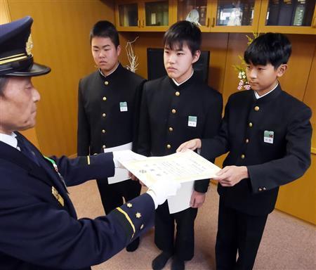 交通事故に遭った女性を救助したとして、大阪府河南町立中学校(河南町)3年の仲上剣誠(けんせい)さん(15)、門前翔和(もんぜん・とわ)さん(14)、仲野将馬さん(15)の3人が、同府富田林市消防本部から感謝状を贈られた。
