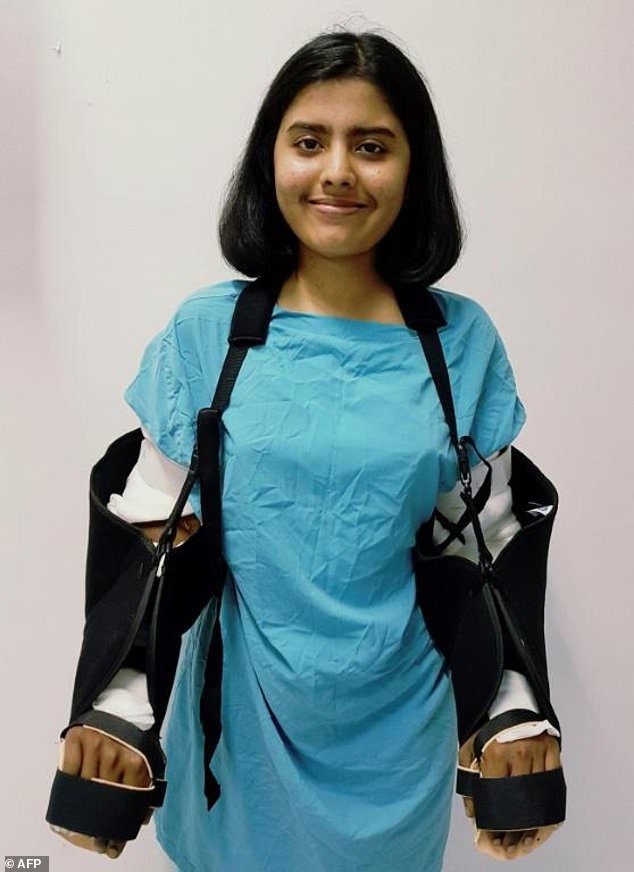 インドのある女性は両腕をバスによる事故で失い、肌の色が暗い男性のドナーから両腕の提供を受けました。