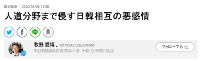 韓半島問題を担当するマキノ・ヨシヒロ(牧野愛博)朝日新聞編集委員は去る6日付フォーブス ジャパンに寄稿した「人道分野まで侵す韓日相互の悪感情」という題名のコラムで「先月27日、コロナ19医療支援に関する話があった」とし、韓国政府が日本に遺伝子増幅(PCR)検査キットやマスクなど医療支援を検討する、という内容に対して「議論したことはない」という菅義偉官房長官の話を紹介した。