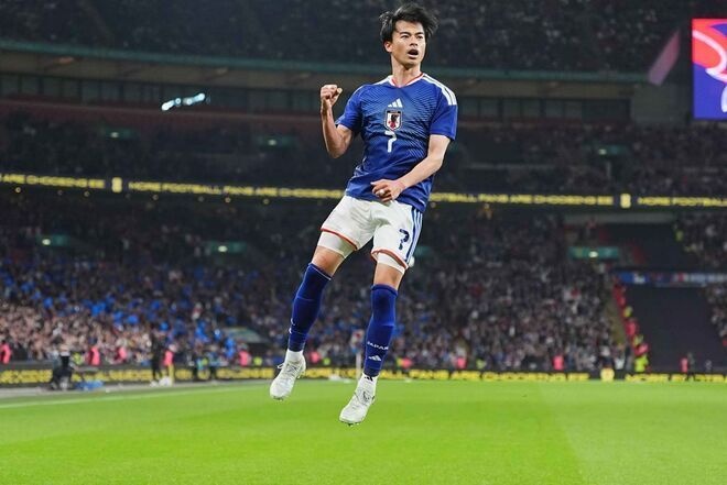 現地3月31日、日本代表は聖地ウェンブリーでイングランド代表との親善試合に臨んだ。序盤からボール支配で劣勢を強いられながらも、日本は揺るぎないプレスと身を挺したブロックで対峙する。すると22分、一気呵成のカウンターから先制点を奪う。左サイドを抜け出した中村敬斗のグラウンダークロスを三笘薫が蹴り込んだのだ。