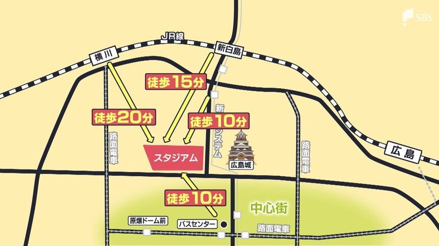 広島城の近く、JR広島駅から約2キロの場所に位置する「まちなかスタジアム」。IAIスタジアムと同様、旧スタジアムはアクセスが課題でしたが、新スタジアムではJRやバスなど主に4つのアクセスルートを確保しました。