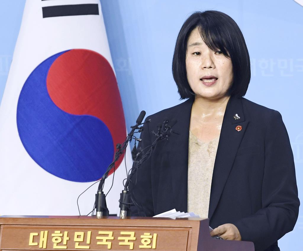 ▲5月29日、ソウル市内で記者会見する「日本軍性奴隷制問題解決のための正義記憶連帯」の尹美香・前代表(共同)韓国の元慰安婦支援団体「日本軍性奴隷制問題解決のための正義記憶連帯」(正義連)の前理事長、尹美香(ユン・ミヒャン)氏(55)が、寄付金流用などの疑惑が続出する中、与党「共に民主党」の1年生議員となった。