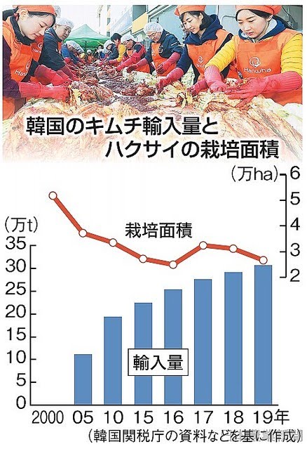一方、キムチ原料となる韓国産ハクサイの栽培面積は減少が続いている。韓国農村経済研究院によると、2000年の5万1801ヘクタールから19年は2万6636ヘクタールと、20年間で半分になった。