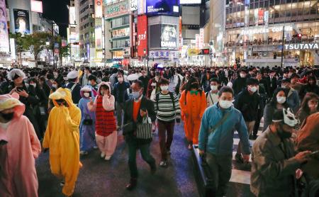 東京都渋谷区の繁華街は夜になって若者らで混雑したが、例年に比べ仮装した人の姿は少なかった。渋谷区はクラスター(感染者集団)発生への危機感から来訪を控えるよう訴え、