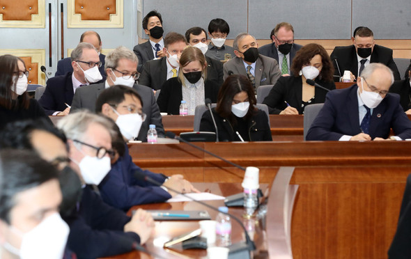 ▲ ハリー・ハリス駐韓米国大使など在韓外交団が6日、ソウル都染洞外交部国際会議場でマスクをつけたまま韓国の新型コロナウイルス感染症への対応及び防疫努力などに関するカン・ギョンファ外交部長官の説明を聞いている=共同取材写真//ハンギョレ新聞社
