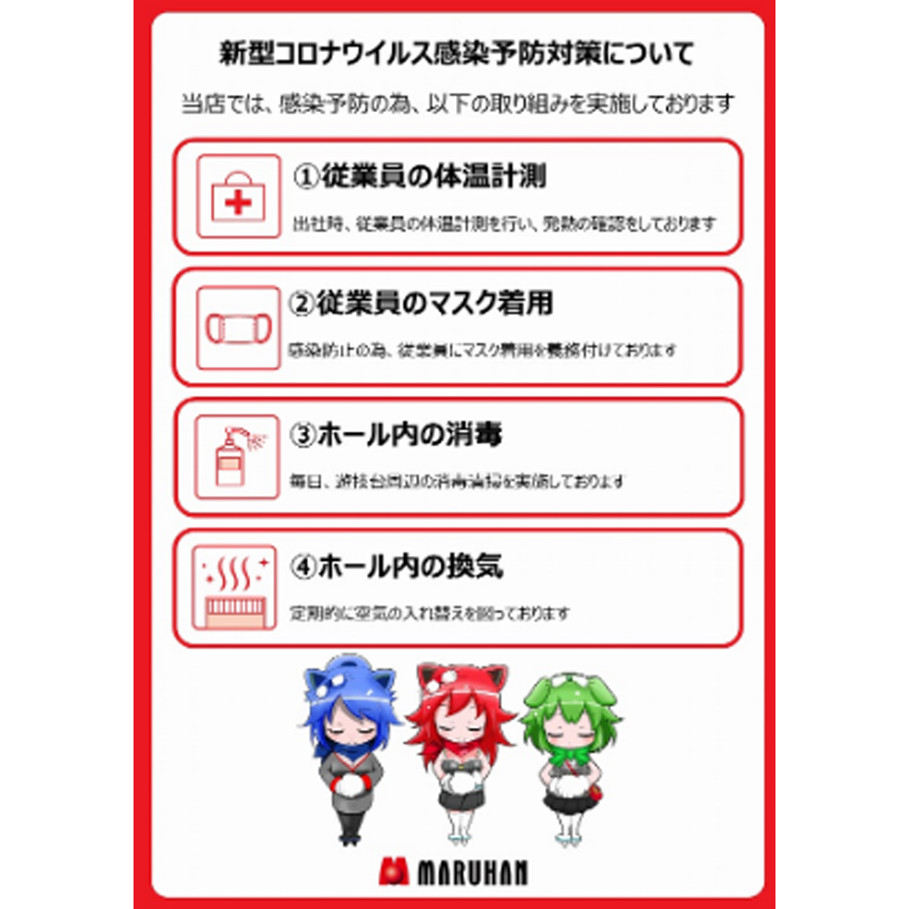 マルハンは3月5日、新型コロナウイルスの感染拡大を考慮し、社内外への被害抑止と来店客および従業員の安全を確保するため、既に準備が整ったホールから実施している対策内容を発表した。