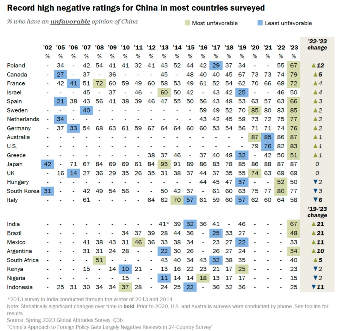 中所得国・高所得国の計24カ国の国民を対象に調査した結果ですが、中央値で成人の67%が中国に対して否定的で、好意的であったのは28%にとどまりました。