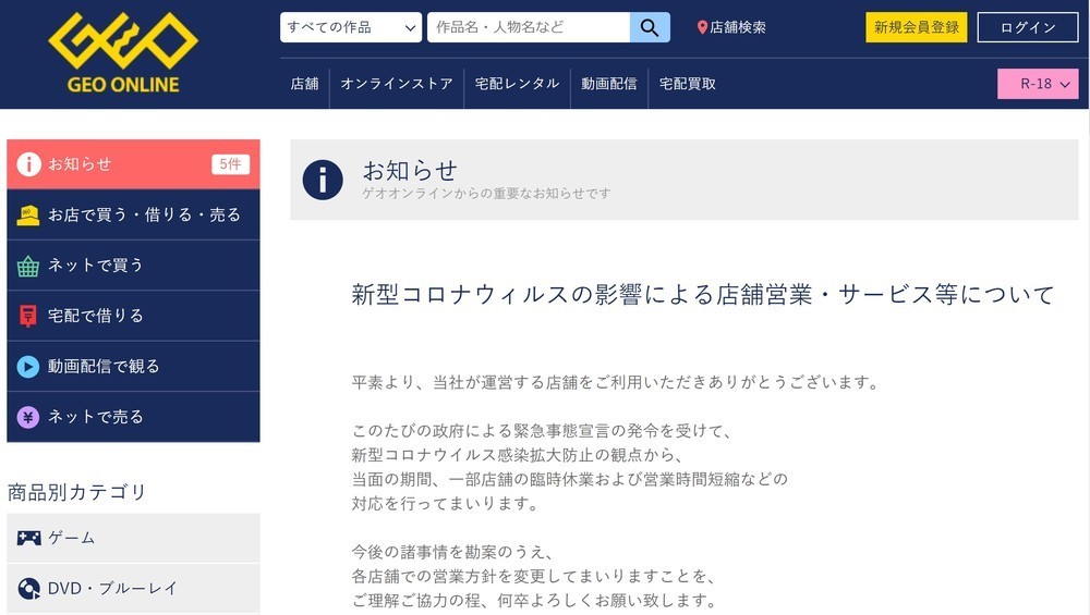ゲオの臨時休業は、同日時点で、都内で1店舗、大阪では0店舗、全国では6店舗だとした。なお、7都府県のほぼ全店で短縮営業をしているという。「感染防止策については可能な限りの策を講じてまいります。緊急事態宣言が全国に拡大されたことによる対応は現在検討中となります」とも説明した。