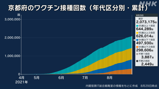 ワクチン接種が進んでいる高齢者は、60代以上の割合が1割未満と大幅に減少。全国的な傾向と同様で、接種が進んでいない世代の感染抑止が課題となっている。府によると、感染「第5波」を迎えた2~15日の新規感染者計4087人を年代別でみると、