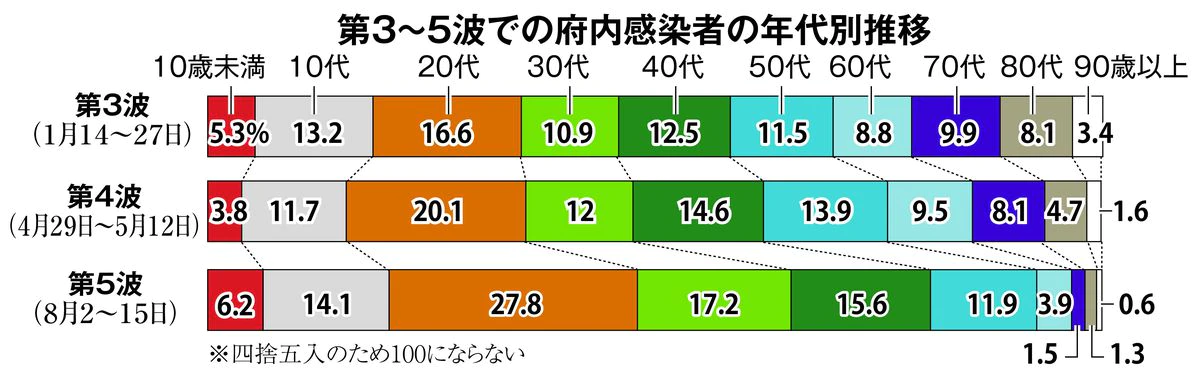 ワクチン接種が進んでいる高齢者は、60代以上の割合が1割未満と大幅に減少。全国的な傾向と同様で、接種が進んでいない世代の感染抑止が課題となっている。府によると、感染「第5波」を迎えた2~15日の新規感染者計4087人を年代別でみると、