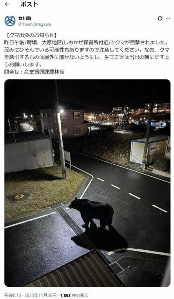女川町は26日、公式Xで「25日午後7時ごろ、大原地区(しおかぜ保育所付近)でクマが目撃された」と投稿。