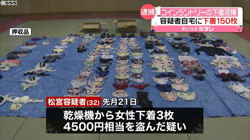 【三重】コインランドリーで乾燥機に頭を突っ込み…50代女性の下着3枚盗んだ疑い 会社員男(32)逮捕 自宅から150枚押収 ※陳列画像