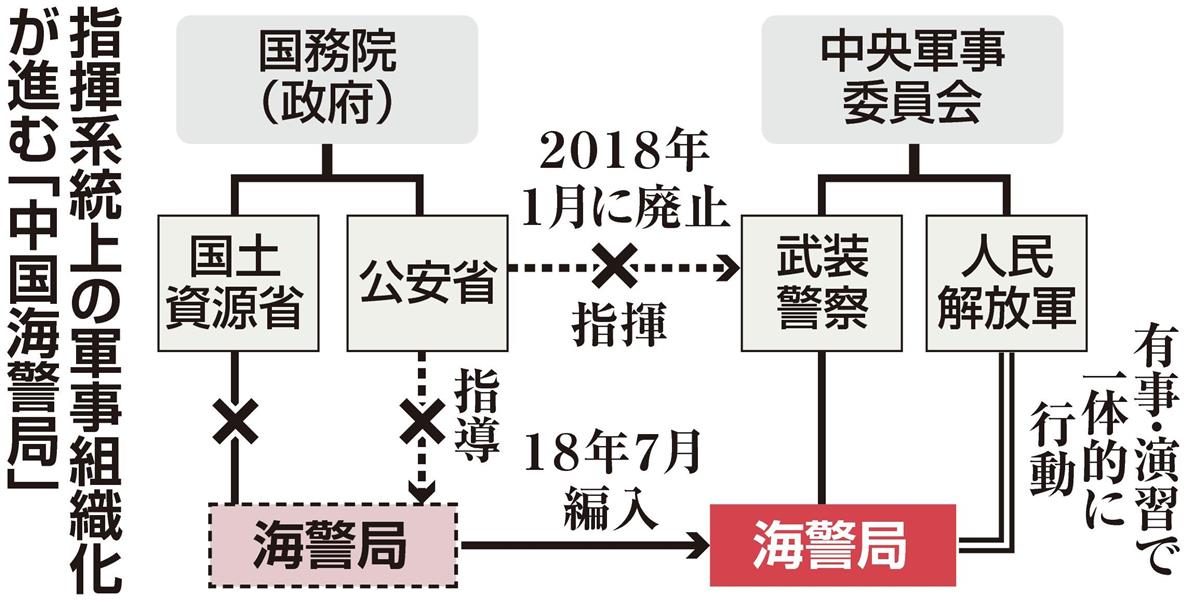 現在、海警は国内の治安維持などにあたる人民武装警察部隊(武警)の傘下にある。武警は2018年1月、国務院(政府)からの「二重指揮」を解消し、中央軍事委の指揮に一本化された。さらに同7月、国務院の管理下にあった海警が武警に編入され、「武装力量(軍事組織)」として位置付けられた。