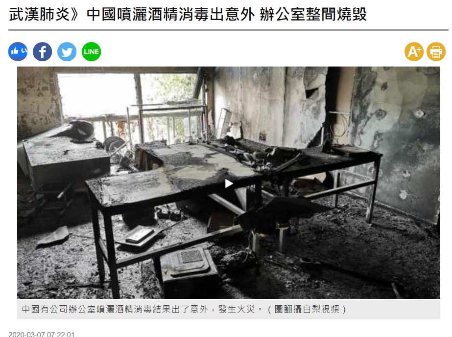 画像は『自由時報 2020年3月7日付「武漢肺炎》中國噴灑酒精消毒出意外 ?公室整間燒毀」(圖翻攝自梨視頻)』のスクリーンショット