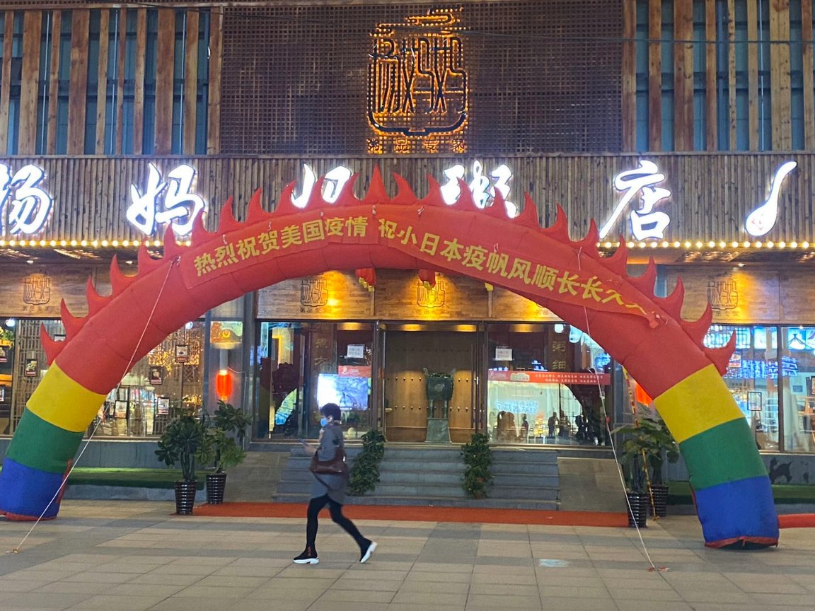 【中国コロナ😭】中国フランチャイズの横断幕「アメリカと日本のウイルス感染が末長くつづきますように」