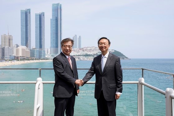 徐薫青瓦台国家安保室長(左)が22日、釜山ウェスティン朝鮮ホテルで楊潔チ中国共産党政治局員と会談を終えた後、海雲台(ヘウンデ)海水浴場を背景に記念撮影を行っている。[写真 青瓦台写真記者団]