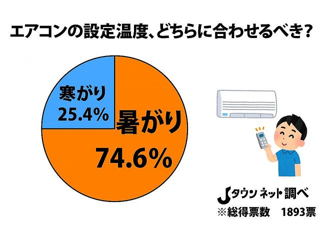 結果を見ると、エアコンの設定温度を「暑がり」に合わせるべきと回答した人は全体の74.6%(1413票)。「寒がり」に合わせるべきと回答したのは全体の25.4%(480票)で、圧倒的に「暑がり」に合わせるべきという意見が優勢となっている。