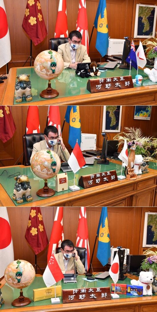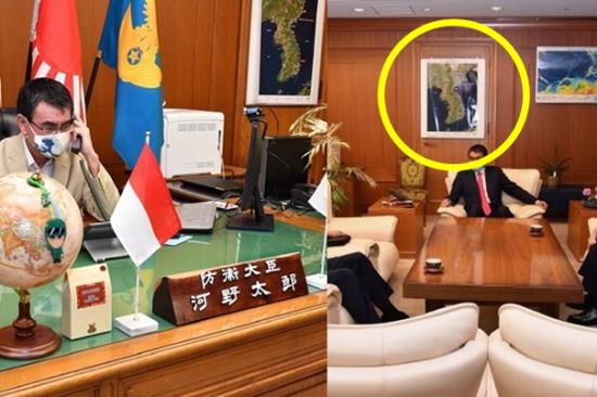 メディアが批判したのは河野長官が先月19日、ツイッターに直接あげた業務遂行写真だ。掲示物には彼がインドネシア・シンガポール防衛長官たちと電話会談した、という内容が含んでいるが見る人の目を引いたのは背景の額縁だった。