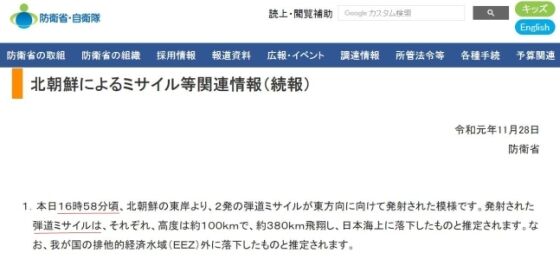 日本の防衛省のホームページには、北韓の飛翔体発射時間と関連して、今日の午後4時58分頃と出ている。一方、河野太郎防衛相は、この日の午後4時58分頃、北韓の「弾道ミサイル」2発が高度100キロ、380キロを飛行したと説明し、