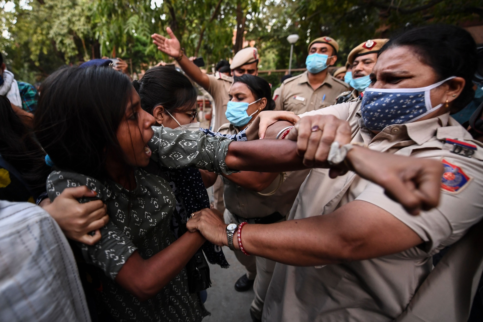 インド・ニューデリーの大学前で行われた、19歳女性の集団レイプ事件への抗議活動で、警察に拘束される学生(2020年10月1日撮影)