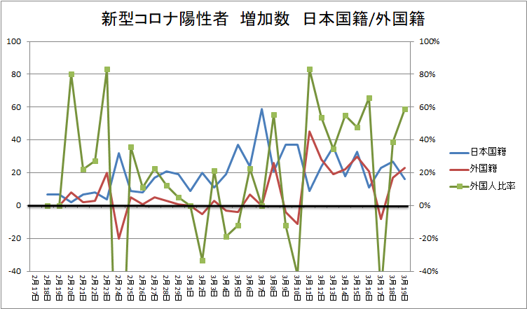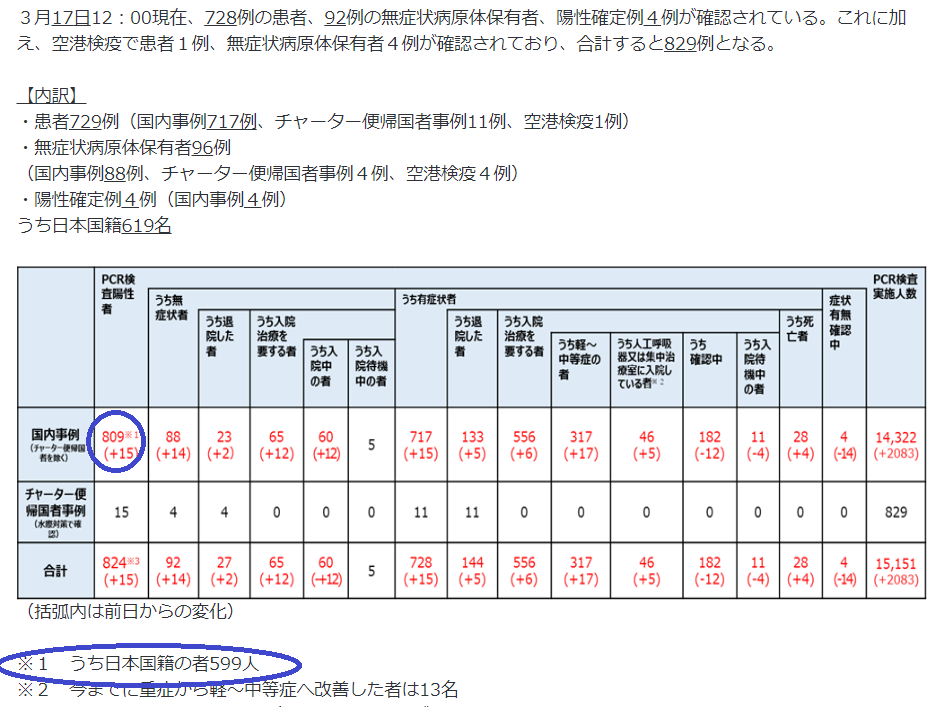 それに対し、翌3月17日。国内事例は809人で前日より15人増加。うち日本国籍者は599人で、前日より23人増加(599-576=23)。陽性者の増加数より、日本国籍者の増加数の方が多いのです。