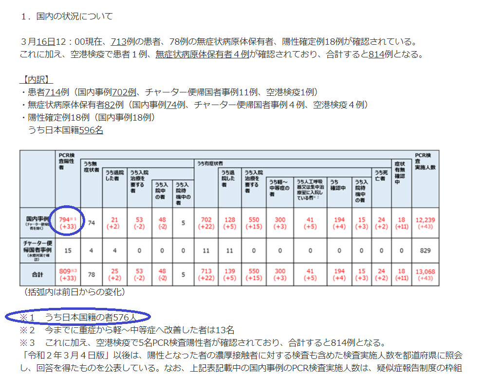たとえば3月16日、国内事例における陽性者数は累積794名、うち日本国籍者は576名と明瞭に記されています。そのため、外国人は794-576=218名です。