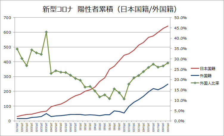 ぱっと見で気づくのは、3月10日以降、外国人数が急増、それにつれて外国人比率がV字型に、非連続的に反転しているということです。これは「累積」の比率なので、ちょっと起こりにくい出来事です。