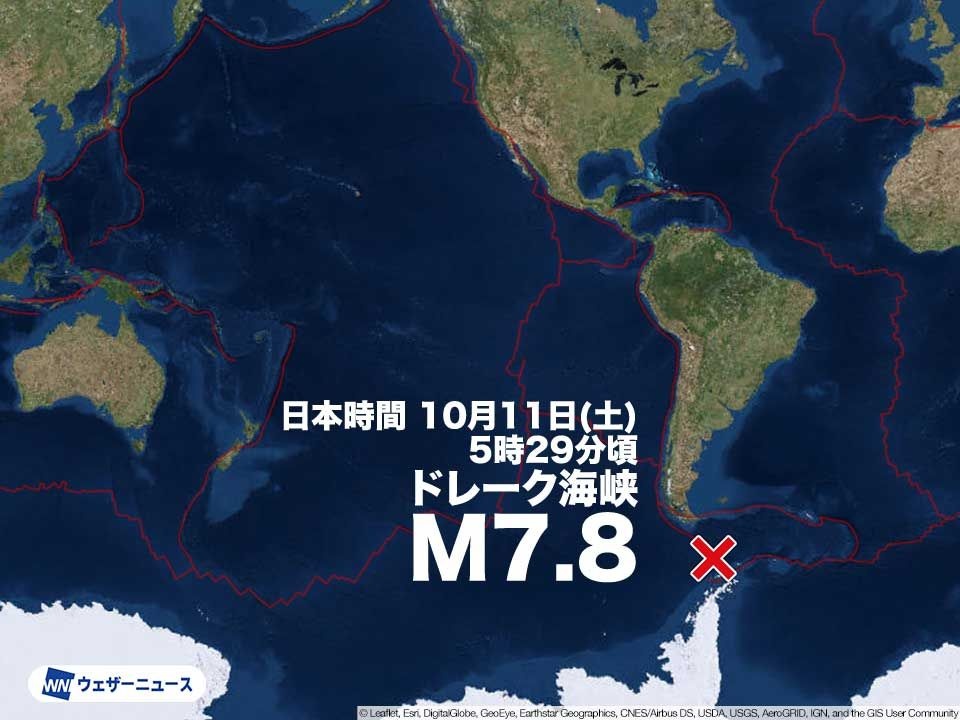 日本時間の10月11日(土)5時29分頃、海外で規模の大きな地震がありました。震源地は南米中部(ドレーク海峡)で、地震の規模(マグニチュード)は7.8と推定されます。