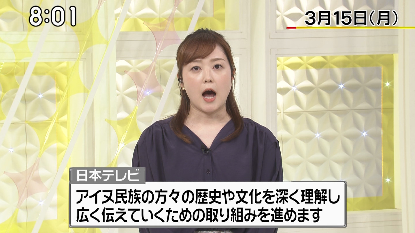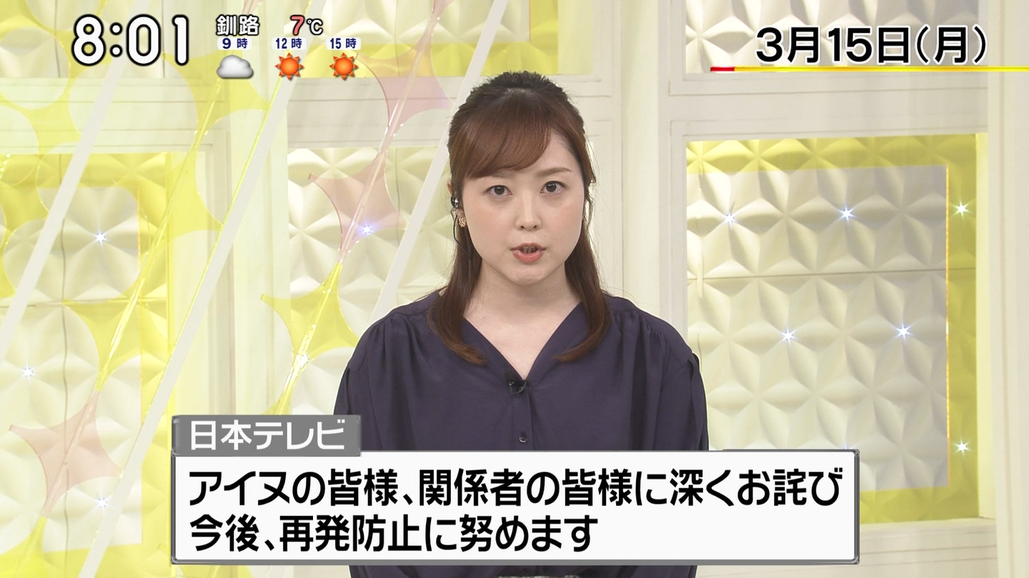 番組冒頭、MCの水卜麻美アナ(33)が「番組からお詫びをさせていただきます」と切り出した。「先週金曜のスッキリでアイヌ民族の女性をテーマにしたドキュメンタリー作品を紹介しました。それを受けての放送の内容について、アイヌ民族の方々を傷つける不適切な表現がありました」と説明。「制作に関わった者にこの表現が差別にあたるという認識が不足していて、番組として放送に際しての確認が不十分でした。その結果十分な正しい判断が行われないまま、アイヌ民族の方々を傷つける不適切な表現で放送してしまいました」と述べ、「日本テレビとしてアイヌの皆様、並びに関係者の皆様に深くお詫びを申し上げるとともに再発防止につとめてまいります」と謝罪。「そしてアイヌ民族の方々の歴史や文化を深く理解して広く伝えていくための取り組みを進めてまいります」とした。