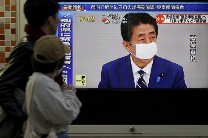 ▲安倍晋三総理が2020年4月7日(火)、東京で国家非常事態を宣言する中、通行人がテレビニュースを見るために立ち止まっている。