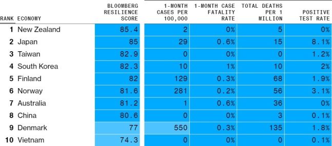 ブルームバーグは、このような基準を適用した場合、ニュージーランドが1位、日本が2位、台湾が3位、韓国が4位とした。