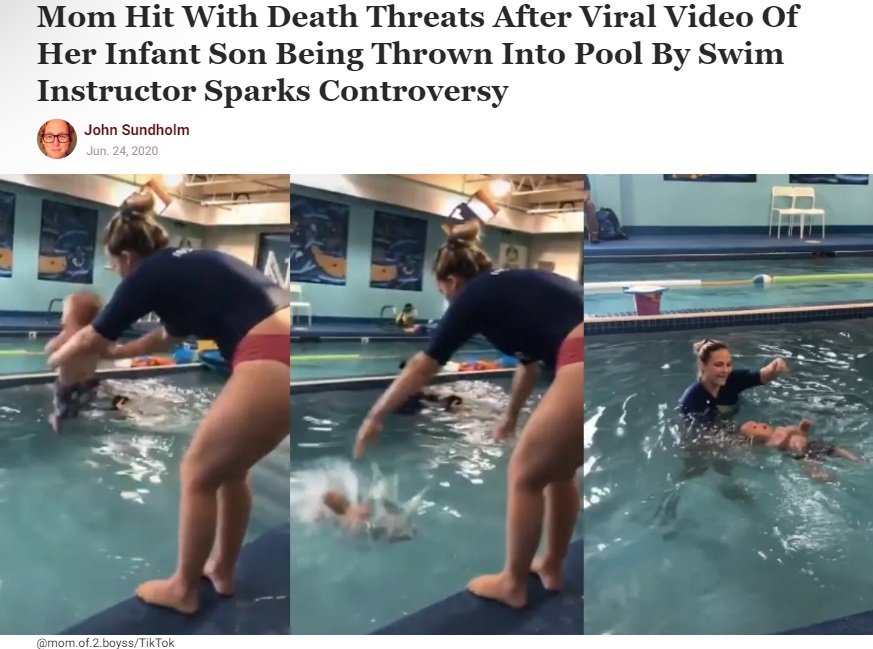 自身のアカウントに生後8か月の息子オリバー君(Oliver)が水泳教室のインストラクターの手によってプールに投げ入れられる様子を投稿した。動画にはオリバー君を投げ入れるや否やインストラクターも水中に入り、自分の力であおむけに浮上したオリバー君を受け止め、周囲が拍手と称賛する様子が映っている。これらはオリバー君の通う米コロラド州コロラドスプリングスにある「リトル・フィンズ・スイムスクール(Little Fins Swim School)」が行うサバイバル・スイミングコースの受講内容の一環である。