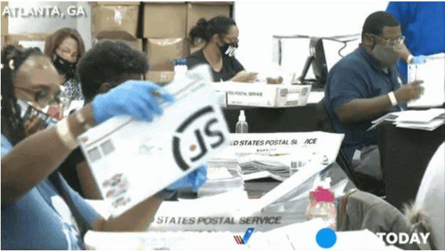 ジョージア州アトランタの投票カウンターは、投票用紙の山から中国の「SFエクスプレス」(SFエクスプレス)を拾い上げて撮影されました。