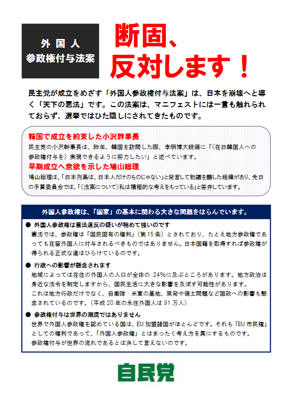 民主党が成立をめざす「外国人参政権付与法案」は、日本を崩壊へと導く「天下の悪法」です。