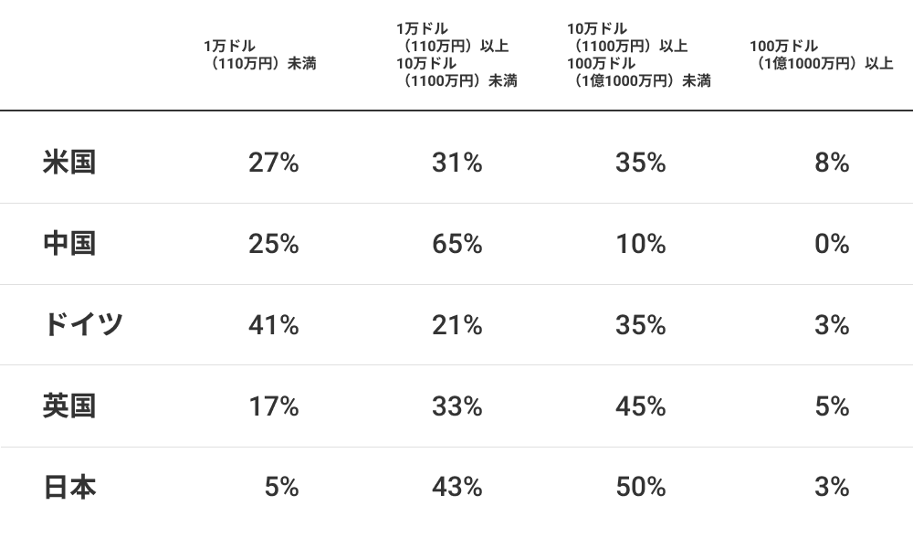 一方で、日本には純資産が5000万ドル(55億円)を超える超富裕層が少ない。超富裕層では米国が8万人超いて圧倒的に多く、次いで中国が約1万8000人、ドイツが約7000人という順番になっている。しかし、日本は4000人弱だ。日本にはそこそこの資産家は多いが、超のつく大金持ちは少ないということだ。