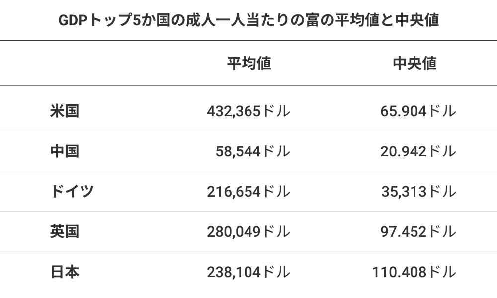 では、富の平均から下位グループはどうだろうか。世界でGDPトップ5か国の成人一人当たりの富の平均値と中央値は、以下のようになっている。