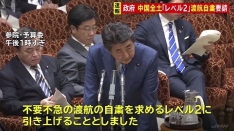 「湖北省を除く、中国全土に対する感染症危機情報を、不要不急の渡航の自粛を求めるレベル2に引き上げることとしました」(安倍首相)