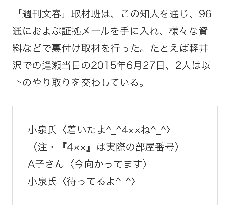 「週刊文春」取材班は、この知人を通じ、96通におよぶ証拠メールを手に入れ、様々な資料などで裏付け取材を行った。たとえば軽井沢での逢瀬当日の2015年6月27日、2人は以下のやり取りを交わしている。