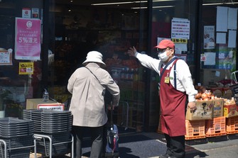 高齢者をスーパーマーケットに迎え入れる店員(右)=大阪府守口市で2020年4月25日午前9時29分、園部仁史撮影