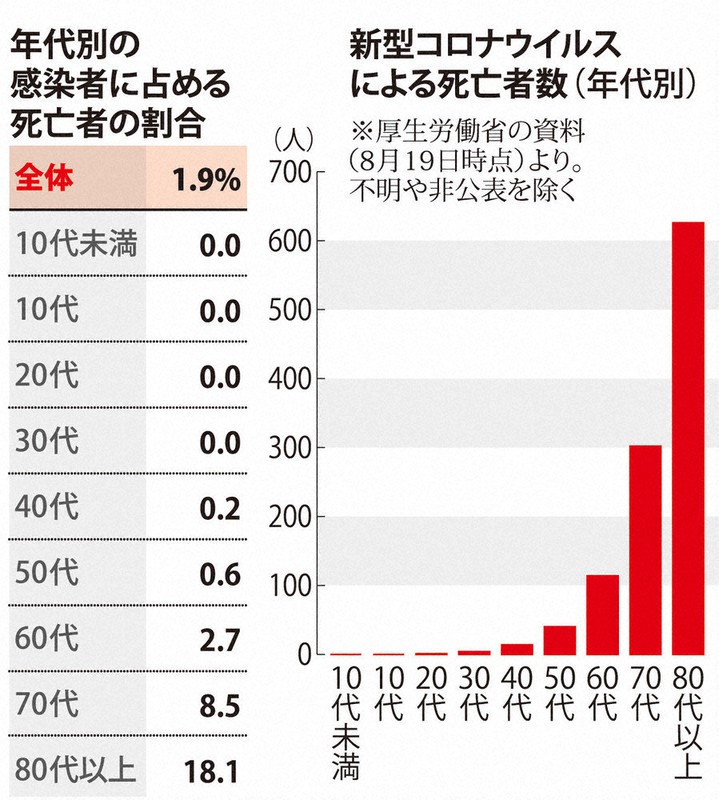 厚生労働省によると、年齢別の死亡率(8月19日時点)は、80代以上が18・1%と最も高く、70代8・5%▽60代2・7%――と続いた。