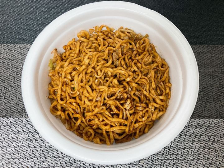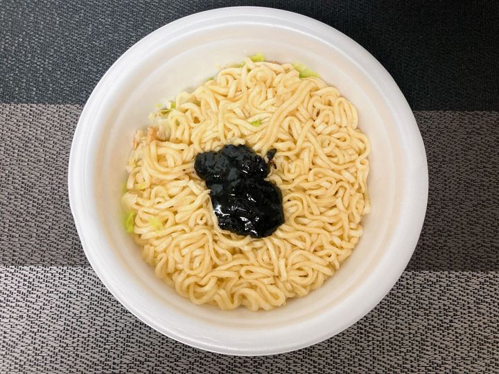 お湯を捨ててふたをはがし、液体ソースをかけてしっかりとかき混ぜていきます。焦げたタマネギや味噌の甘くこうばしい香りが鼻へ抜け、