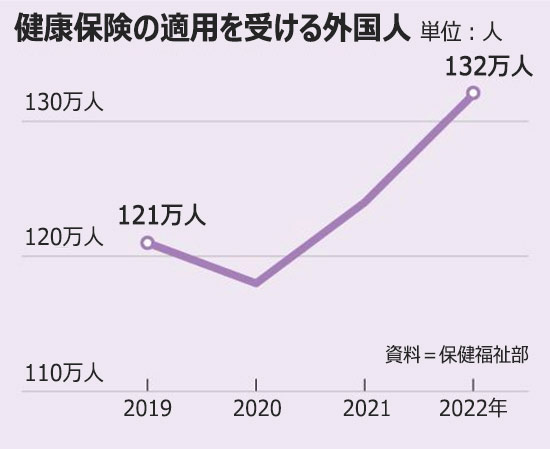 健康保険の適用を受ける外国人は2019年末の121万人から昨年末には132万人と、3年で11万人増えた。