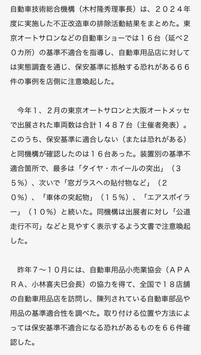 ナンバーつけてる車両だけが 違法改造かどうかの対象なんだろ 自動車技術総合機構はナンバーついてないとそもそも相手にしない