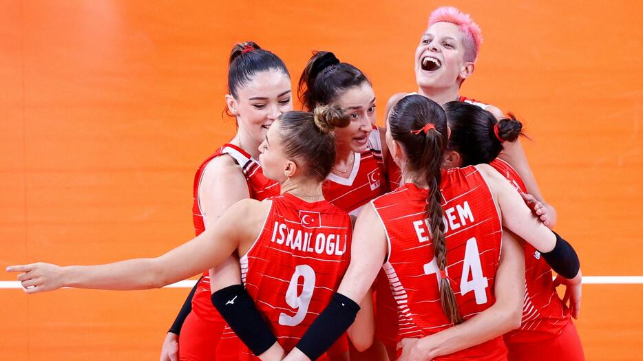 バレーボール女子1次リーグB組のアルゼンチン戦で、得点を喜ぶトルコの選手たち=31日、有明アリーナ(ロイター=共同)