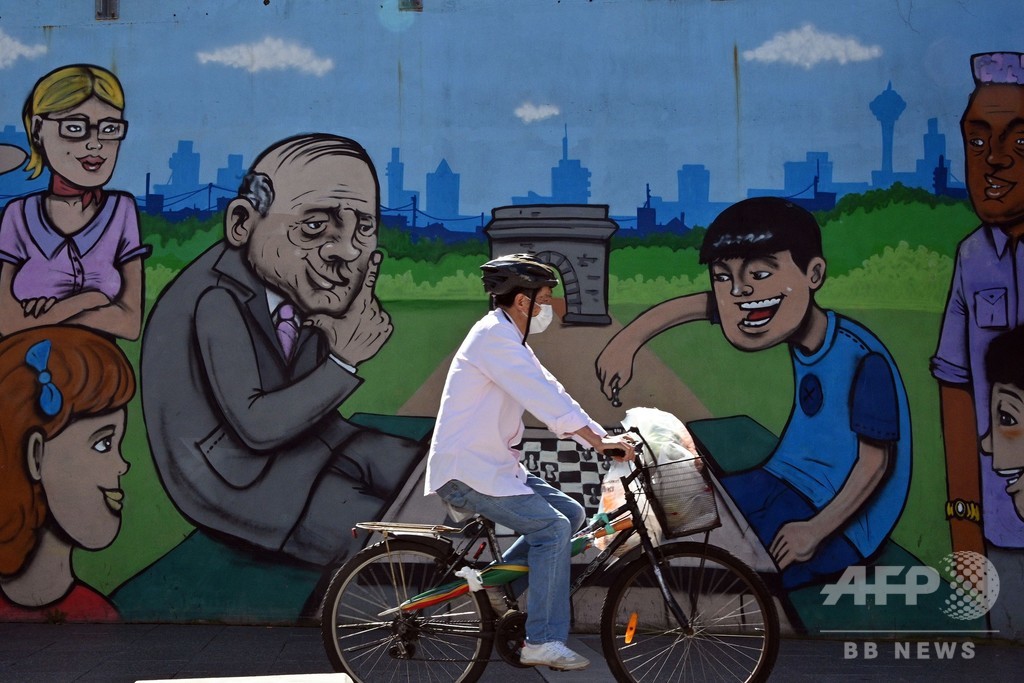 豪シドニー郊外で、マスクを着用し自転車で壁画の前を通り過ぎる男性(2020年4月14日撮影、資料写真)。(c)Saeed KHAN / AFP