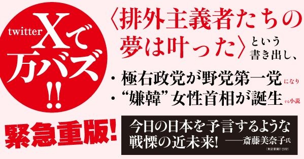 「他にもっと思想の偏った女性議員はいくらでもいて、でも彼女は穏当なほうだと僕も安心してたんだけど、まったくの見当違いだった。あれは決して傀儡の総理じゃない。絶対に男どもの操り人形なんかじゃない。同性婚を合法化したり、選択的夫婦別氏制度を実現したり、労働力としての移民受け入れを推進したりする一方で、在日コリアンだけを攻撃対象に特化してるというのは、大衆の心を熟知している優れた実務家ってことだろう。それにもっと厄介なのは、あれが無思想の人間なのかわからない点。