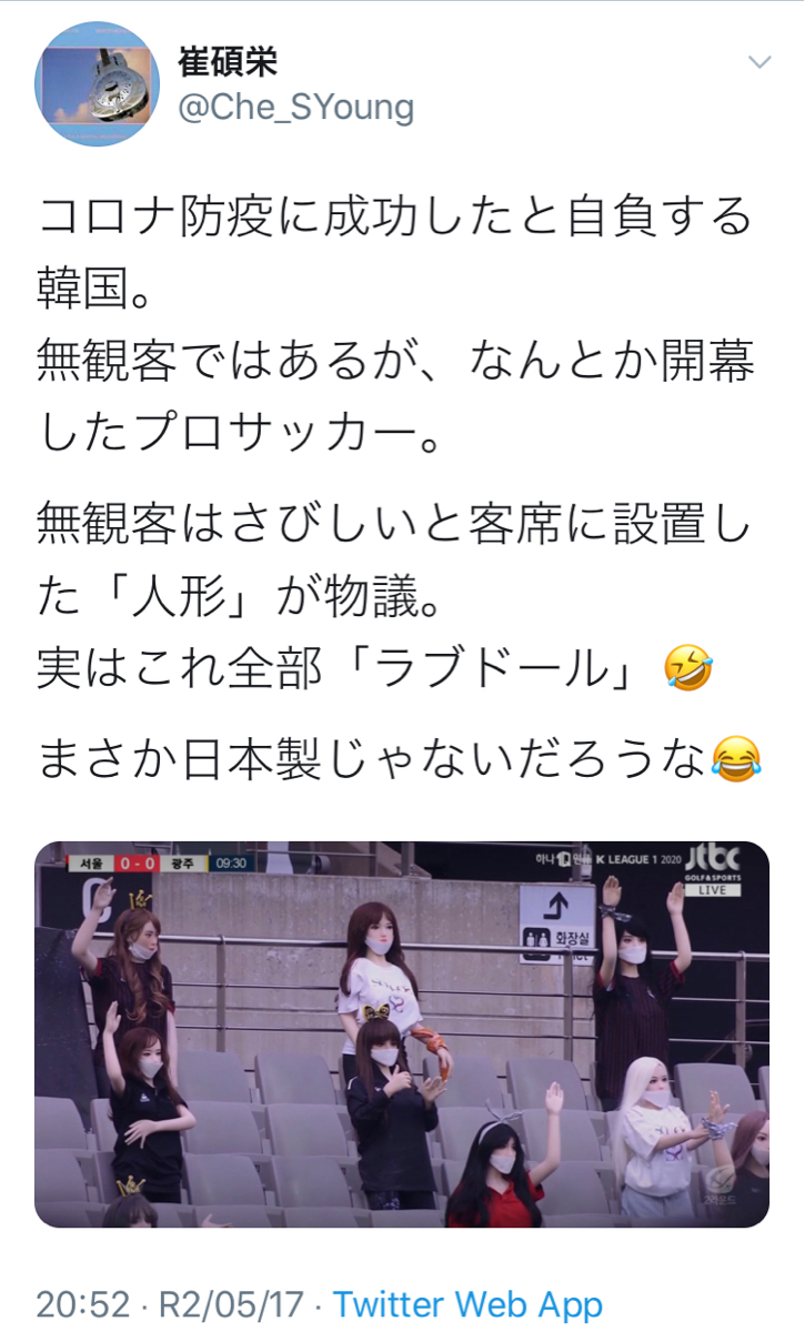 無観客ではあるが、なんとか開幕したプロサッカー。無観客はさびしいと客席に設置した「人形」が物議。